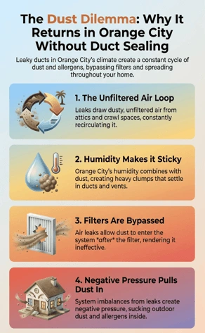 If dust keeps resurfacing in your Orange City home no matter how often you clean, the issue often isn’t housekeeping or filters—it’s what your ductwork is pulling in behind the scenes. Based on what we see in local homes, unsealed ducts commonly draw in attic dust, insulation fibers, and outdoor debris, then recirculate it through your living space. This page breaks down why dust won’t stay away without proper air duct sealing, what makes this problem so common in Central Florida homes, and how sealing the system addresses the source of the dust—not just the symptoms.